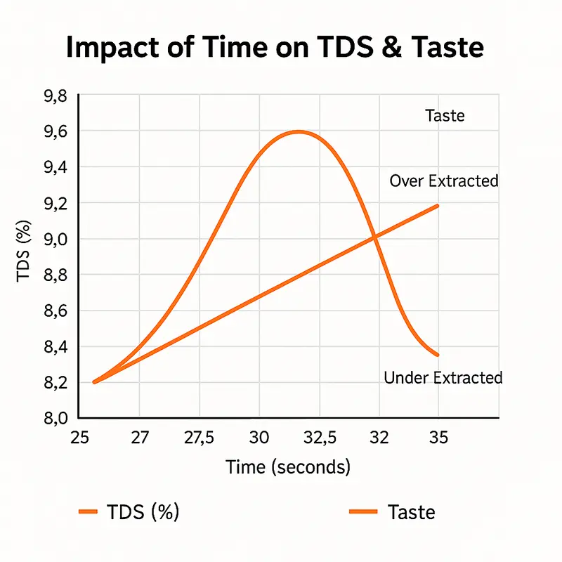 زمان یکی از سه ضلع اصلی مثلث عصاره‌گیری است. اگر زمان خیلی کوتاه باشد، قهوه «زیر عصاره‌گیری» می‌شود: ترش، ناپایدار و تند. اگر زمان بیش از حد طولانی شود، قهوه شما تلخ، خشک و بیش‌عصاره‌گیری‌شده خواهد بود. بهترین محدوده زمانی برای اسپرسو معمولاً بین ۲۵ تا ۳۰ ثانیه است. اما این عدد مطلق نیست؛ بلکه بستگی به نوع قهوه، دستگاه و پارامترهای دیگر دارد.