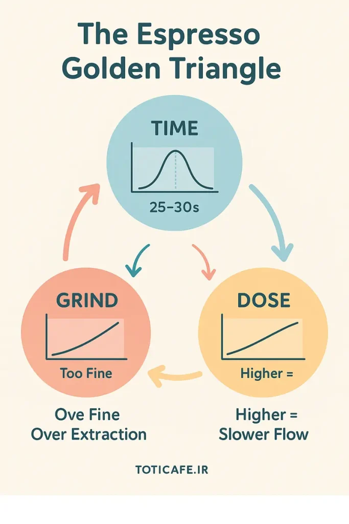 سه متغیر اصلی اسپرسو به‌هم متصل‌اند. شما نمی‌توانید یکی را بدون تأثیرگذاری بر دیگری تغییر دهید.
