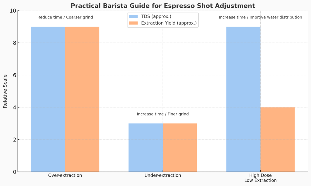 اغلب باریستاها زمانی که یک اسپرسو طعمی تلخ دارد، تصور میکنند که قهوه بیش از حد «قوی» شده است ، در حالی که ممکن است بازده استخراج بالا رفته باشد، نه Strength . بالعکس ، اگر قهوه رقیق و آبکی باشد، معمولاً گمان میکنند بازده پایین است ، در حالی که ممکن است صرفاً TDS کم باشد و EY همچنان در محدودهی مناسب باشد .