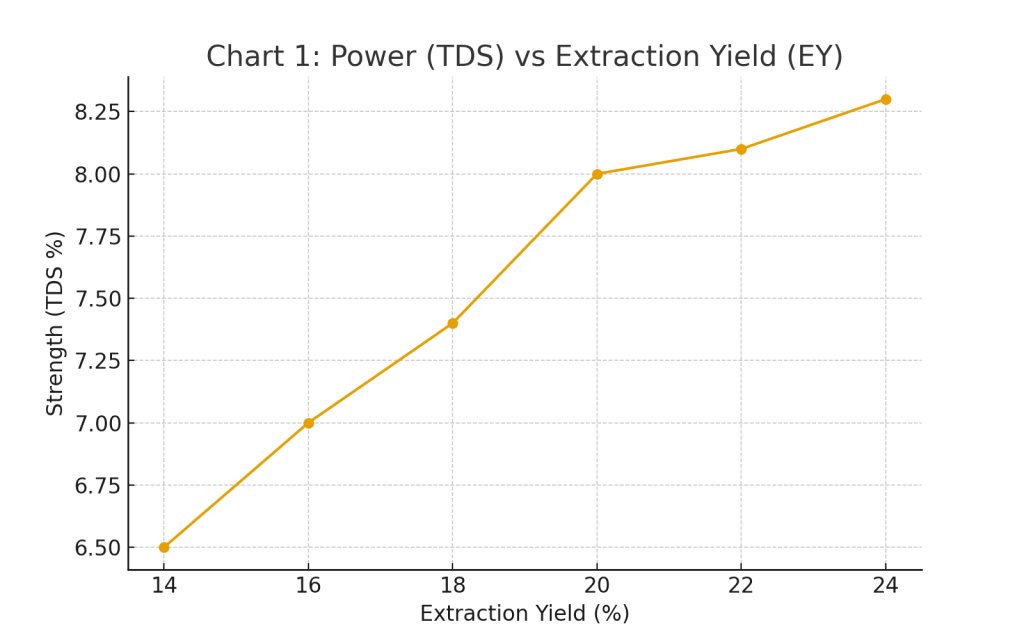 شاید این تجربیات متناقض از درک نادرست تفاوت دو مفهوم کلیدی در عصارهگیری قهوه ناشی شده باشد: قدرت (Strength) و بازده استخراج (Extraction Yield).