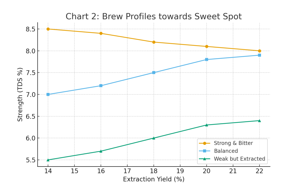 Tip Box : قدرت قهوه با افزایش دوز یا کاهش نسبت دمآوری قابل افزایش است، اما بازده استخراج تنها با کنترل پارامترهایی چون دما، زمان، و آسیاب بهینه میشود.