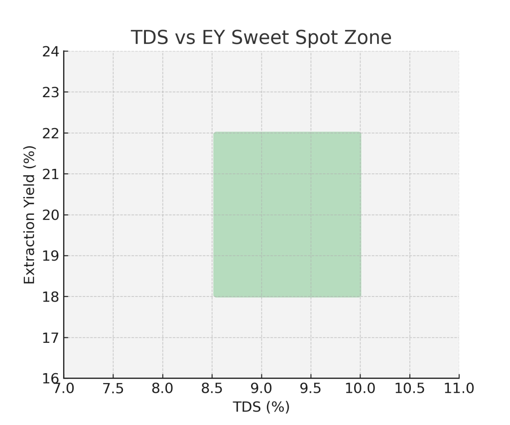 بر خلاف مفهوم توازن استخراج (Extraction Balance) که بیشتر به تعادل میان ترکیبات محلول اشاره دارد، Sweet Spot مفهومی کیفیتر است. یعنی حتی اگر TDS و EY شما در بازه مناسب باشند، ممکن است طعم همچنان به Sweet Spot نرسیده باشد.