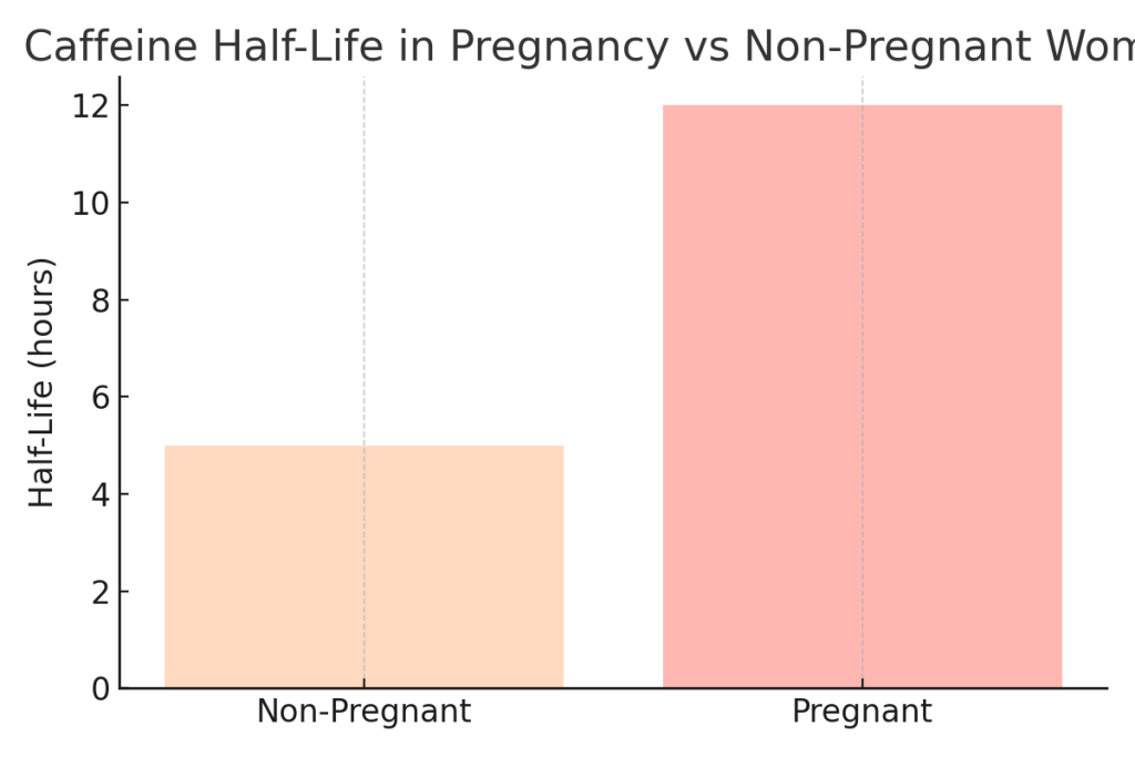 - نیمهعمر کافئین در بارداری افزایش مییابد (از ۴–۶ ساعت به ۱۰–۱۸ ساعت).