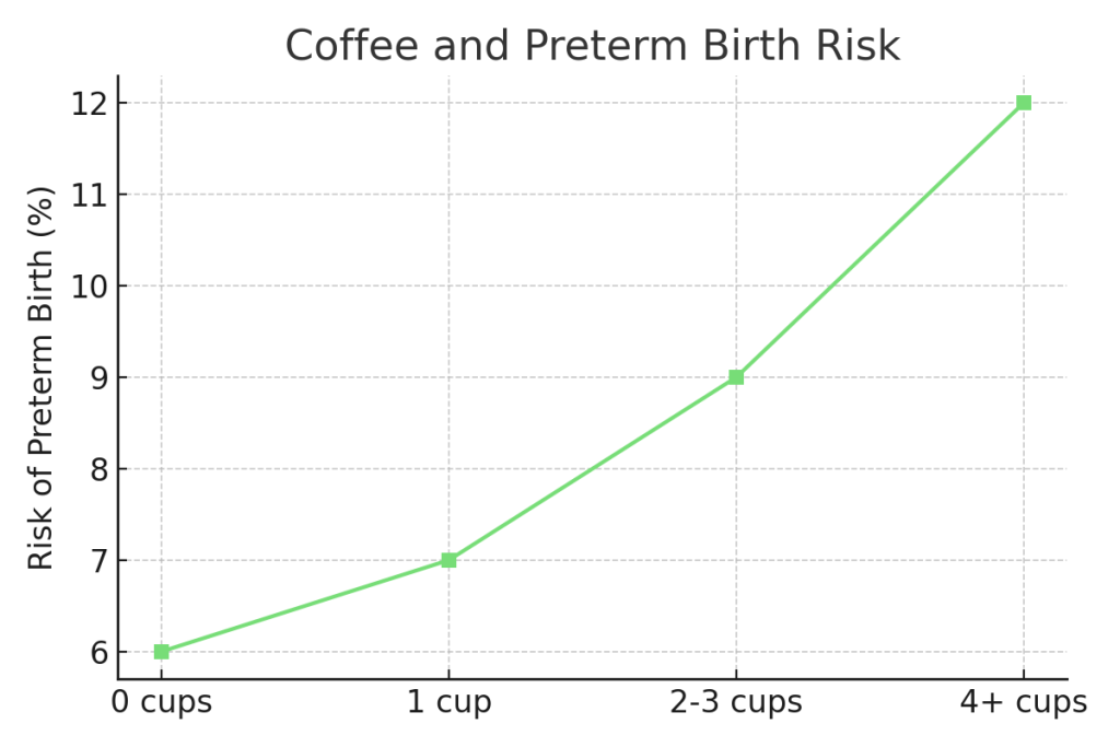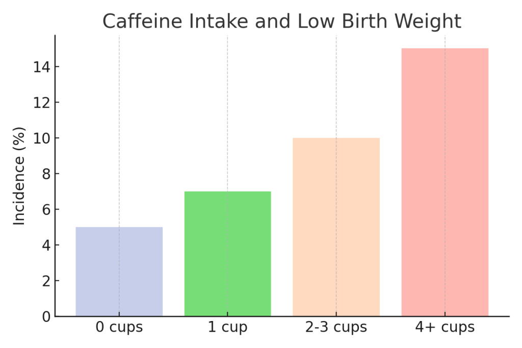 - مطالعه Scandinavian Journal of Public Health (2019): مصرف بالای کافئین با ۲۷٪ افزایش خطر تولد نوزاد با وزن کمتر از ۲۵۰۰ گرم همراه بود.