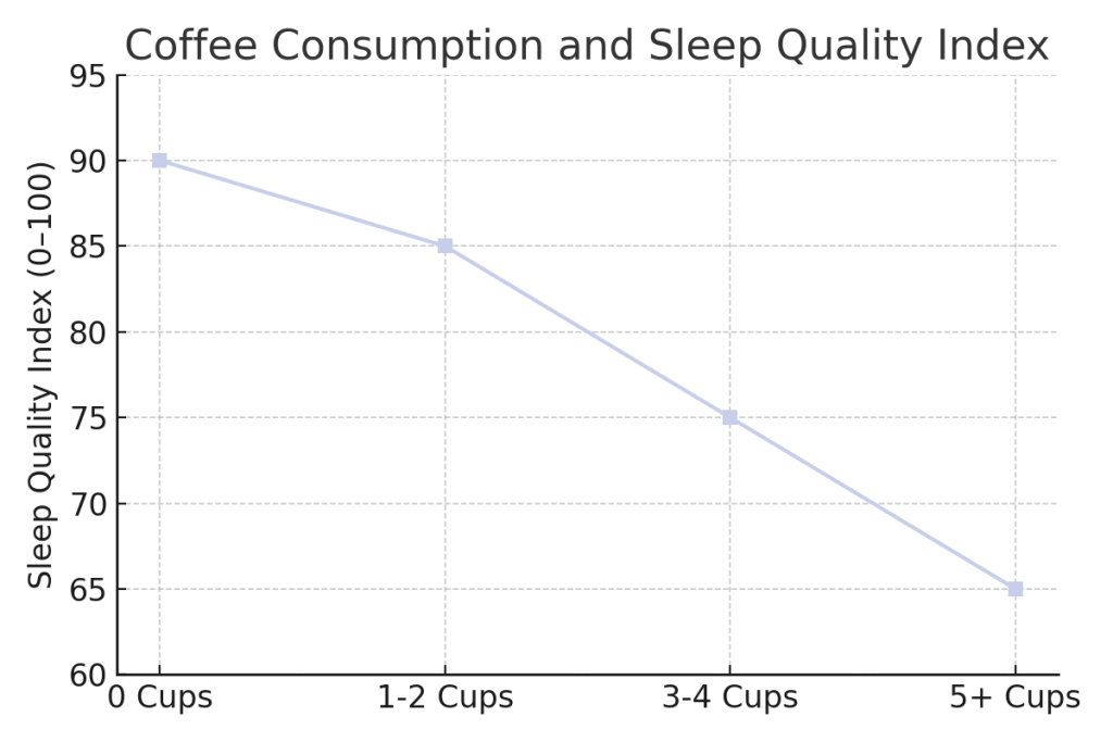 - مطالعهای در Harvard Medical School (2018) نشان داد که افرادی که بیش از ۳ فنجان قهوه در روز مینوشند، کیفیت خوابشان به طور میانگین ۱۵٪ پایینتر گزارش شده است.