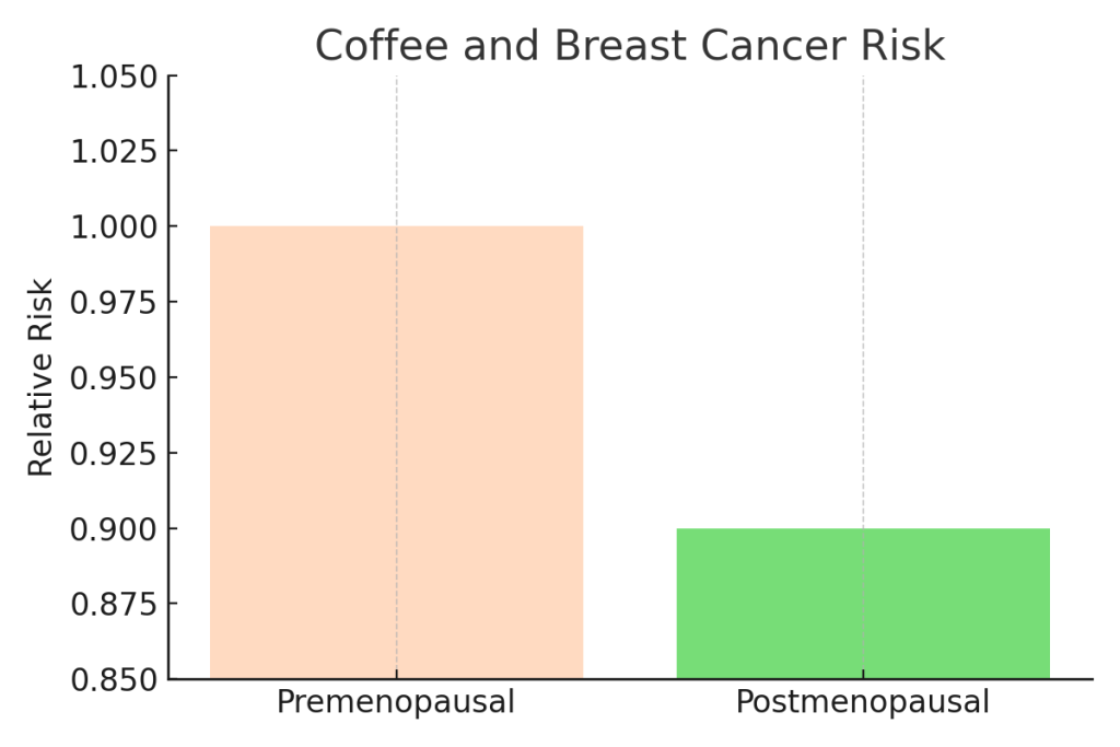 - مطالعه Breast Cancer Research (2018) : قهوه در زنان یائسه با کاهش ۱۰٪ خطر سرطان سینه همراه بود، اما در زنان جوان اثر قابل توجهی نداشت.