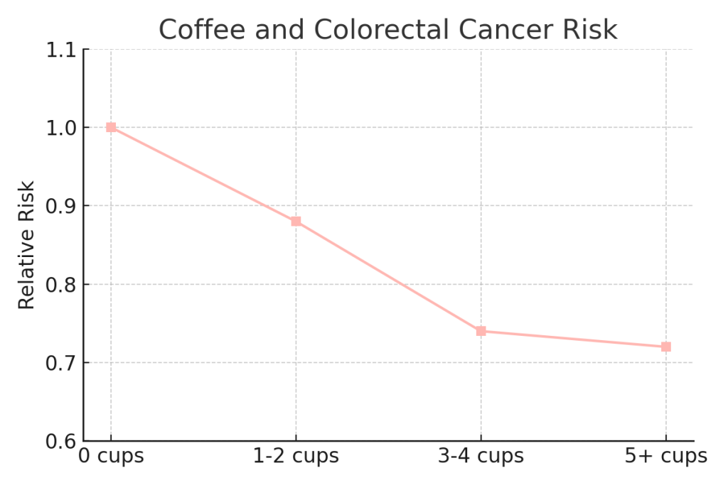 - مطالعه JNCI (2016) : افراد با مصرف ۳–۴ فنجان قهوه در روز، ۲۶٪ کمتر در معرض سرطان کولورکتال بودند.