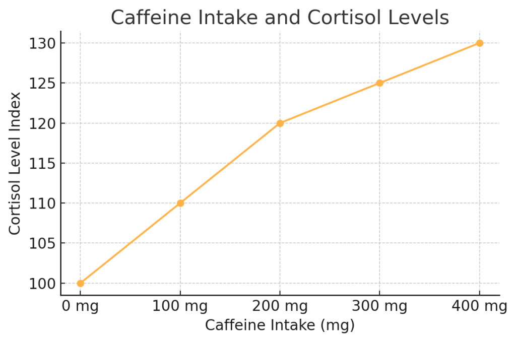 - مطالعهای در Journal of Psychopharmacology (2015) نشان داد که مصرف ۳۰۰mg کافئین سطح کورتیزول را به طور متوسط ۲۵٪ افزایش میدهد.
