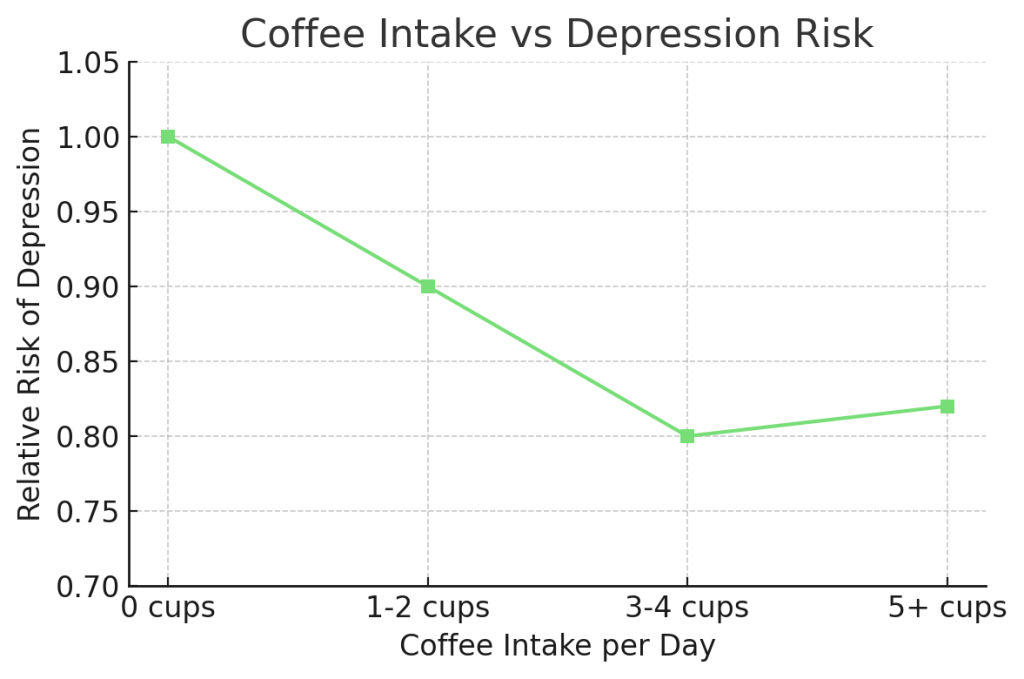 - متاآنالیز در ANZJP (2016): مصرف ۲–۴ فنجان قهوه روزانه، ۲۰٪ کاهش خطر افسردگی.