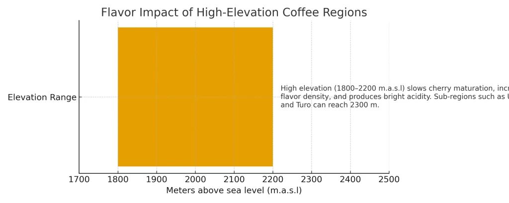 | ۱۸۰۰ تا ۲۲۰۰ m.a.s.l | این ارتفاع بالا باعث رشد کند گیلاس، تراکم بیشتر مواد طعمی، و اسیدیته درخشان میشود. زیرمناطق مانند Uraga و Turo حتی تا ۲۳۰۰ متر هم بالا میروند. |
