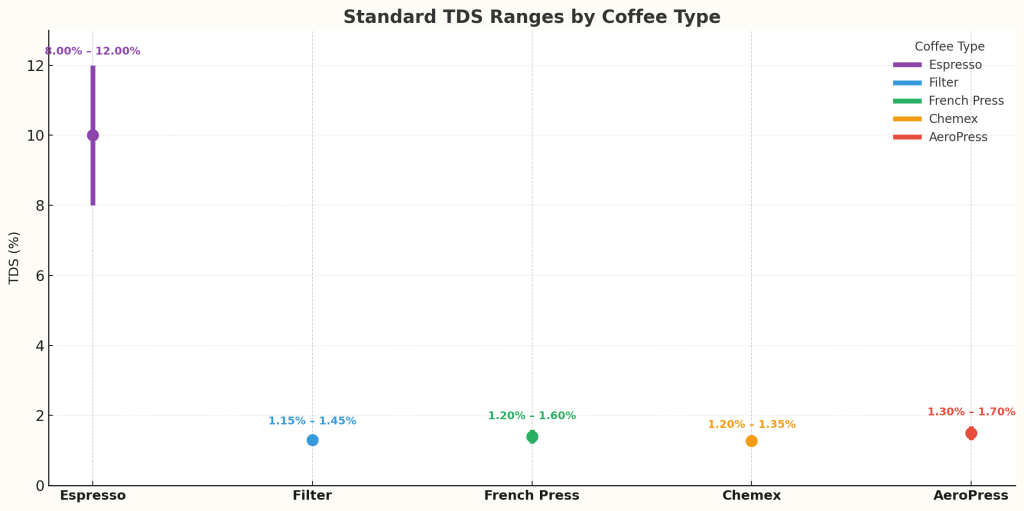 - در قهوه فیلتری، معمولاً TDS بین ۱.۱۵٪ تا ۱.۴۵٪ است .