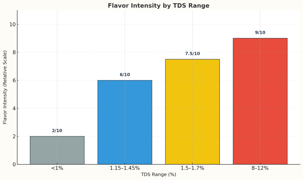 یکی از مهمترین بخشهای درک TDS، فهم تأثیر آن بر حس چشایی است. اگر TDS پایین باشد، فنجان شما آبکی ، بدون بافت و بدون عمق طعمی خواهد بود . اگر بیش از حد بالا باشد، نوشیدنی بیش از حد قوی، تلخ و سنگین میشود .