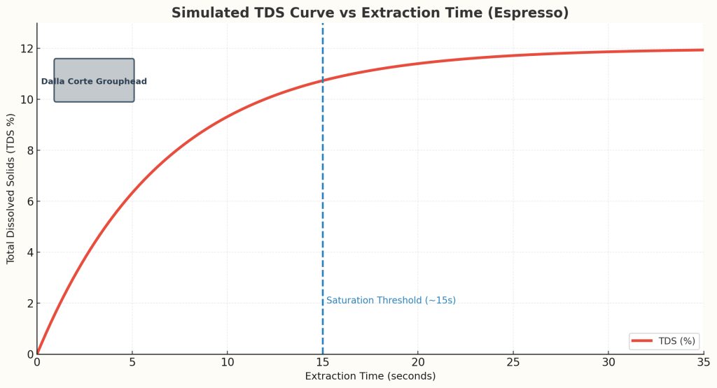 این نمودار، منحنی تغییرات TDS (مجموع جامدات محلول) را در طول زمان عصارهگیری اسپرسو نمایش میدهد. در محور افقی زمان برحسب ثانیه و در محور عمودی مقدار TDS به درصد نمایش داده شده است. همانطور که مشاهده میشود، در ۱۵ ثانیهی ابتدایی، مقدار TDS با سرعت بالایی افزایش مییابد، زیرا بخش عمدهی ترکیبات محلول و خوشطعم قهوه در این بازه استخراج میشود. پس از آن، منحنی به حالت اشباع نسبی میرسد و افزایش TDS بسیار کند میشود. ادامهی عصارهگیری پس از این نقطه، باعث ورود ترکیبات ناخواسته مانند تلخیهای خشک و طعمهای Over – extracted خواهد شد. این نمودار اهمیت مدیریت صحیح زمان قطع عصارهگیری را بهخوبی نشان میدهد و بهویژه برای تنظیم دقیق رسپی اسپرسو در دستگاههای حرفهای مانند دالا کورته بسیار کاربردی است.
